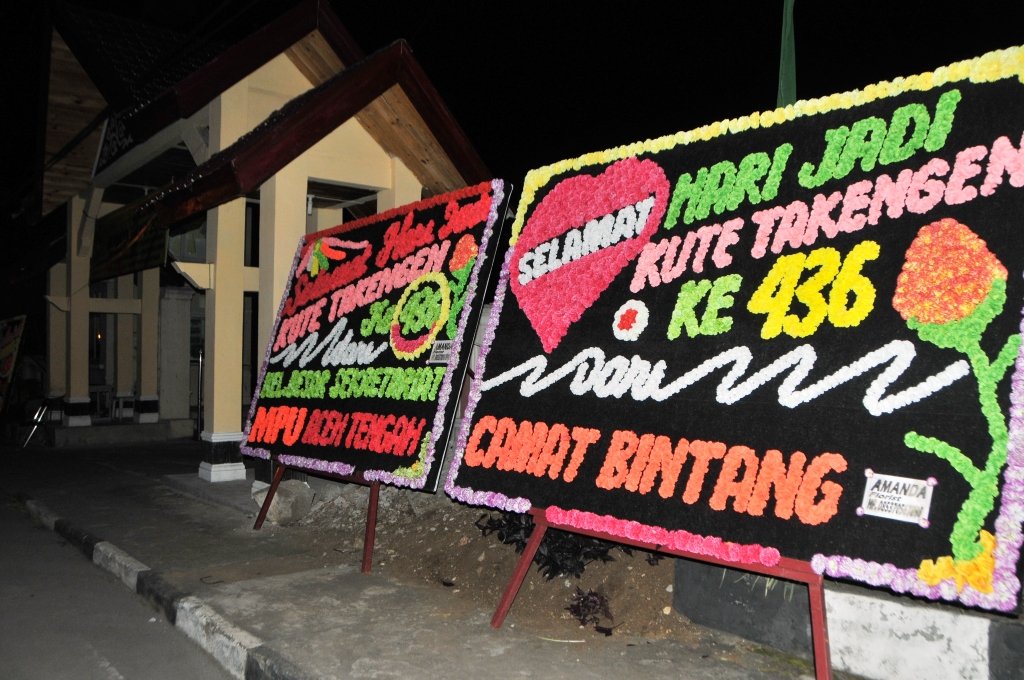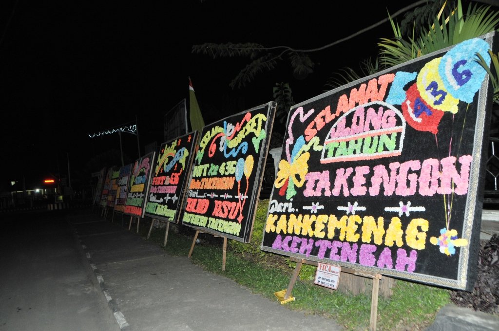 PAPAN BUNGA HUT TAKINGEN : Puluhan papan bunga ucapan selamat Hari Ulang Tahun (HUT) Kute Takingen mulai dipajang di kawasan jalan protokol diseputaran kota Takengon sejak Sabtu 16 Februari 2013 malam. Papan bunga ini umumnya atas nama instansi pemerintah yang ada di Kabupaten Aceh Tengah. (Lintas Gayo | Kha A Zaghlul)