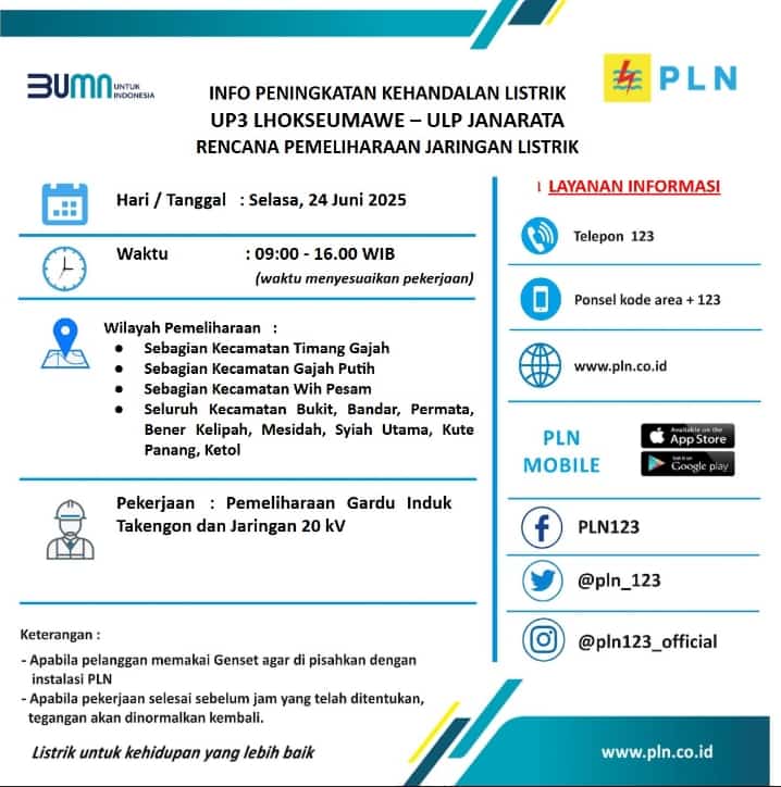 Redelong | Lintasgayo.com – Kabupaten Bener Meriah akan mengalami pemadaman listrik hampir di seluruh kecamatan kecuali Pintu Rime Gayo, Selasa (24/06/2025) besok.