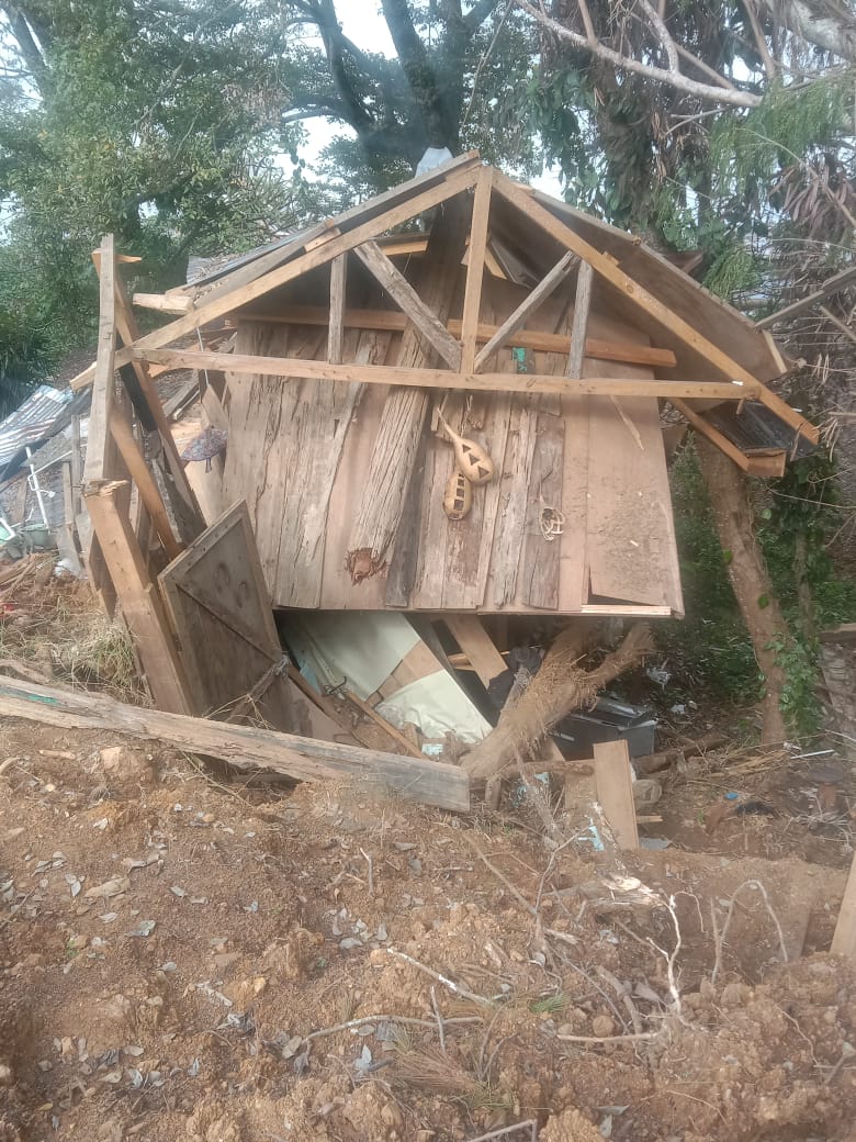 Tanah tanah kuning menutupi sebagian rumah yang rebah dan berantakan. Pojok yang diukir masih tersangkut di dinding kayu. Sangkut dipaku.