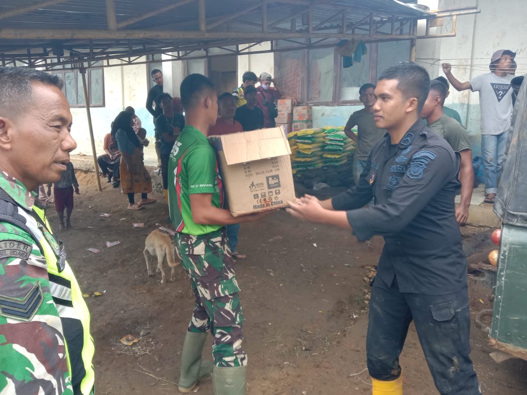 Anggota TNI ini, rinci Babinsa, membantu membersihakan jalan longsor, membuat jembatan dan sejumlah kegiatan sosial bagi penyintas. Dipimpin Letda Inf. Admiral.