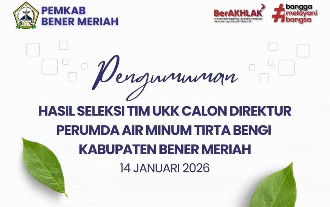 Pengumuman itu tertuang dalam Pengumuman Nomor : 500/01/2026 tentang Hasil Seleksi Tim UKK Calon Direktur Perumda Air Minum Tirta Bengi Kabupaten Bener Meriah, Rabu (14/01/2026).